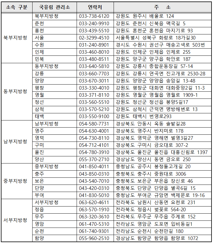 자세한 사항은 위의 산림청 소재지 관할 국유림관리소로 문의하면 안내를 받을 수 있네요...